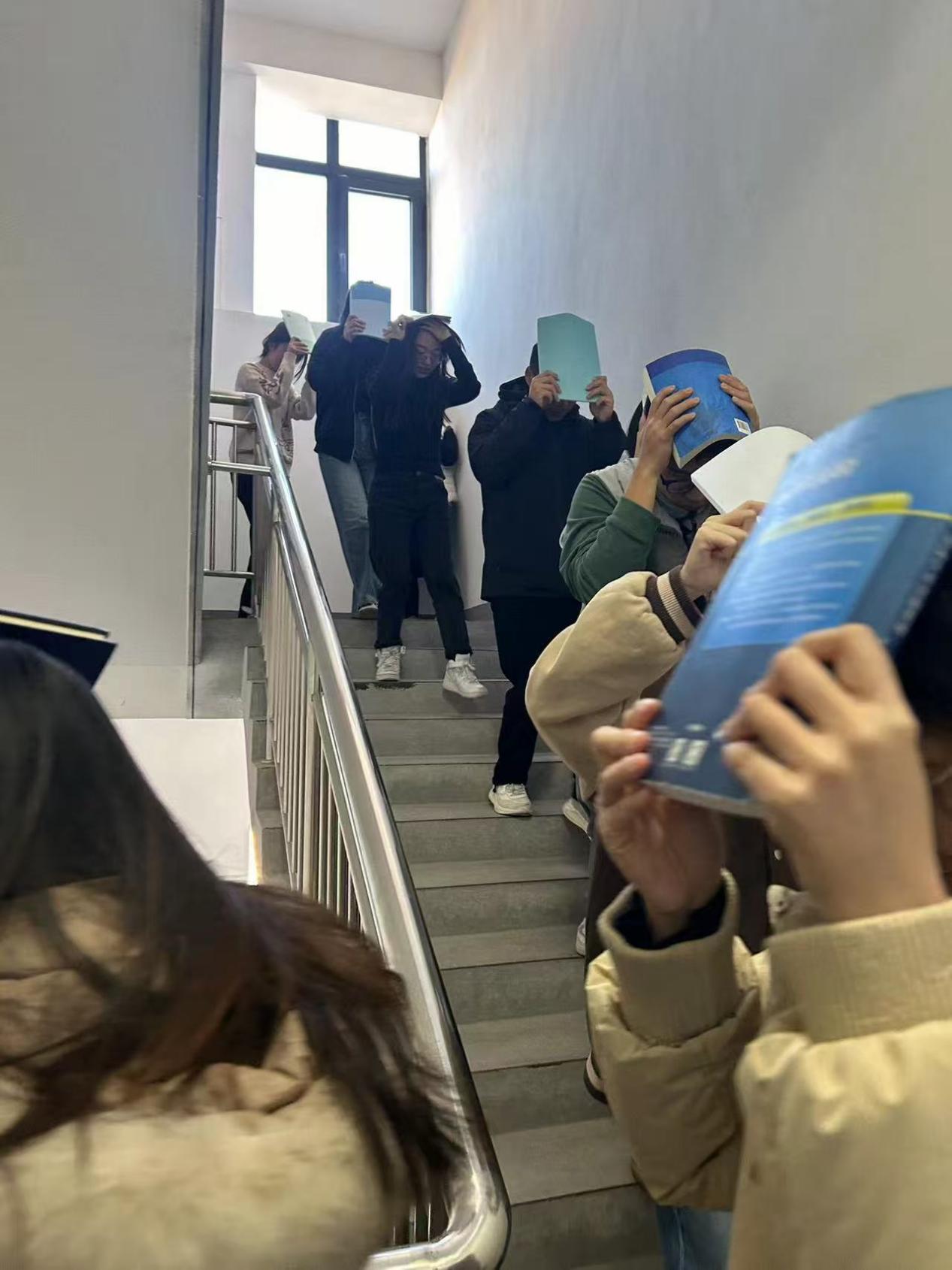演练正式启动。模拟预警信号响起,教学楼内师生立即听从各楼层的安全员指挥,根据预先制定的疏散计划,迅速到位,引导学生沿着指定路线快速撤离至集合点。整个过程紧张有序,学生们在安全员的带领下有条不紊地完成了疏散任务。